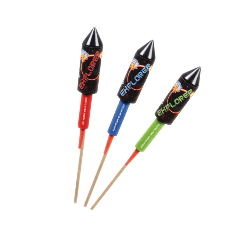 Razzi assortiti con scia oro con apertura crackling/ rossa, argento lampeggiante/blu e time rain, rossa verde/gialla e verde lampeggiante.